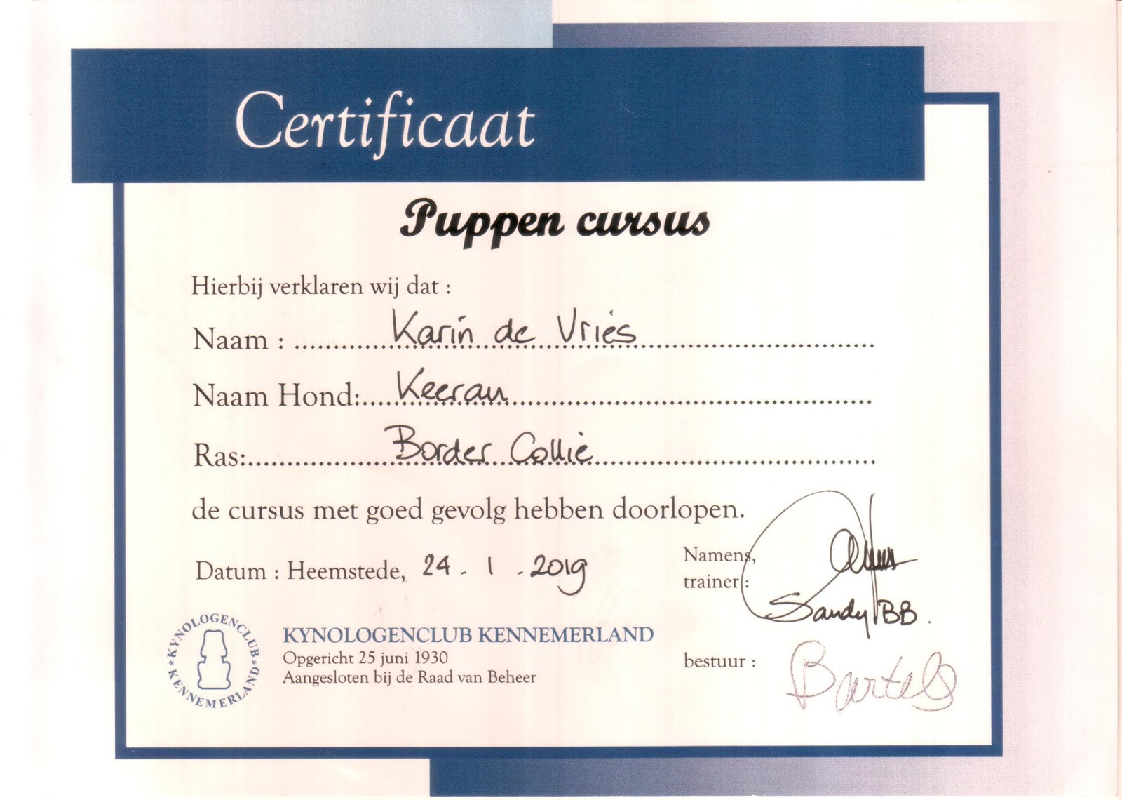 Gisteren was de laatste les van de puppycursus en ik kreeg een heus certificaat!