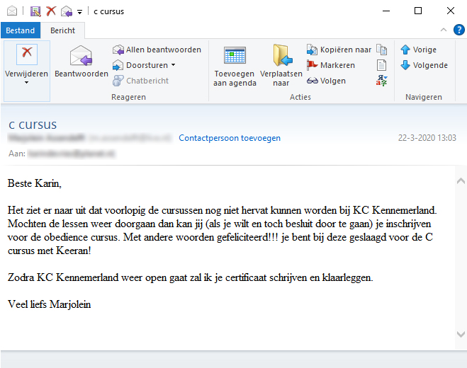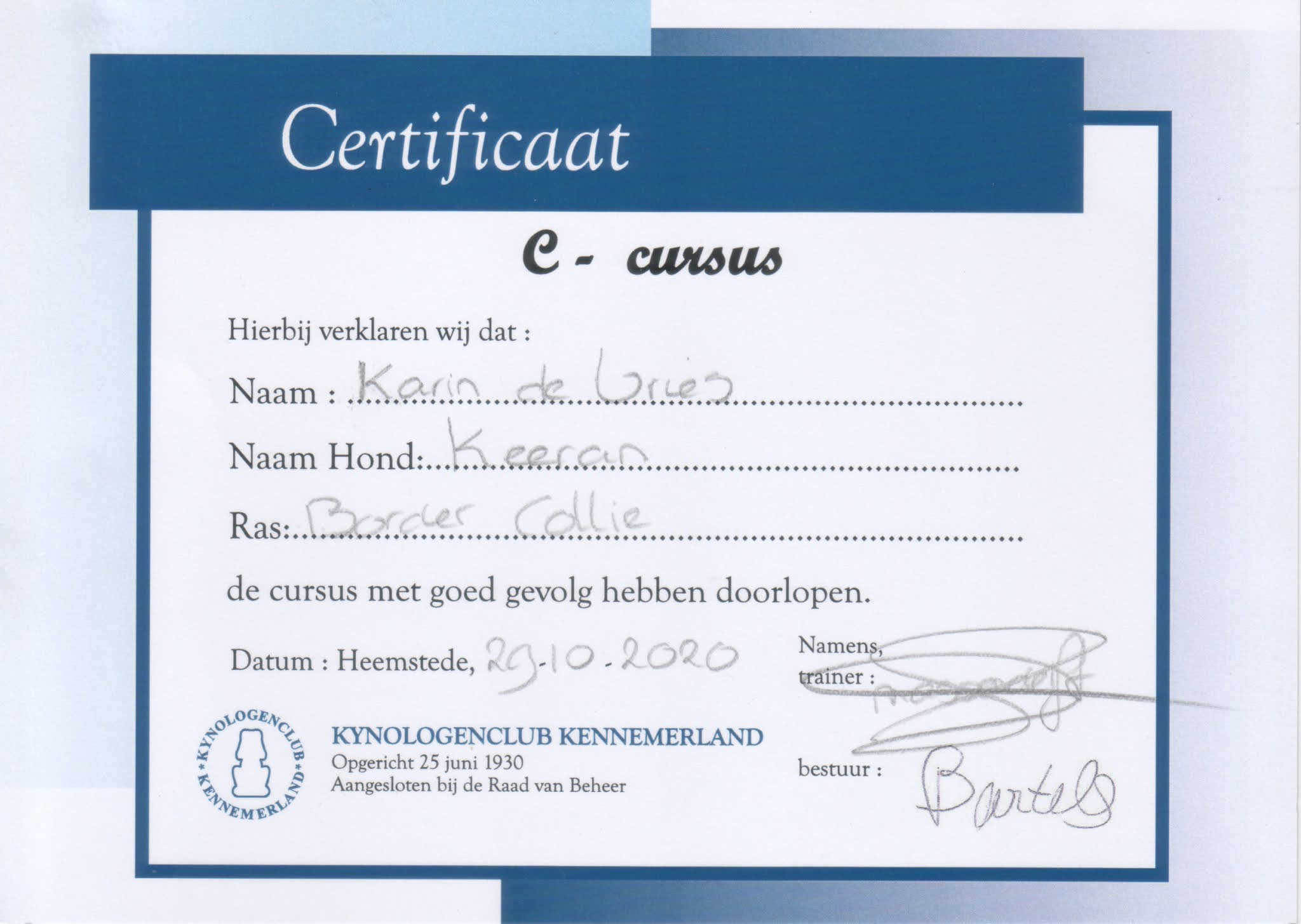 In maart van dit jaar (zie deze post) heb ik al verteld dat de hondenschool was stil gelegd, nèt voor mijn examen voor het C-certificaat.