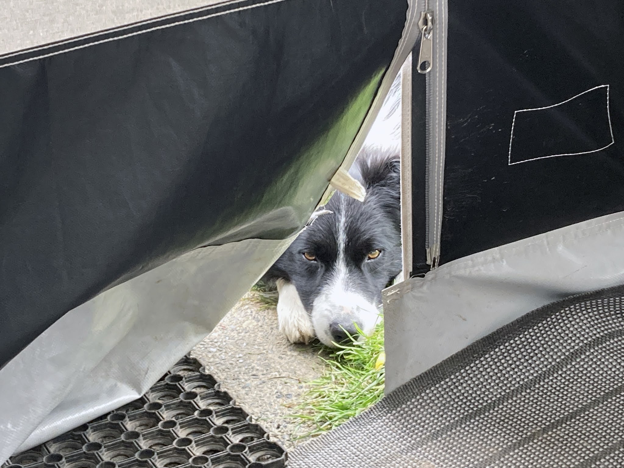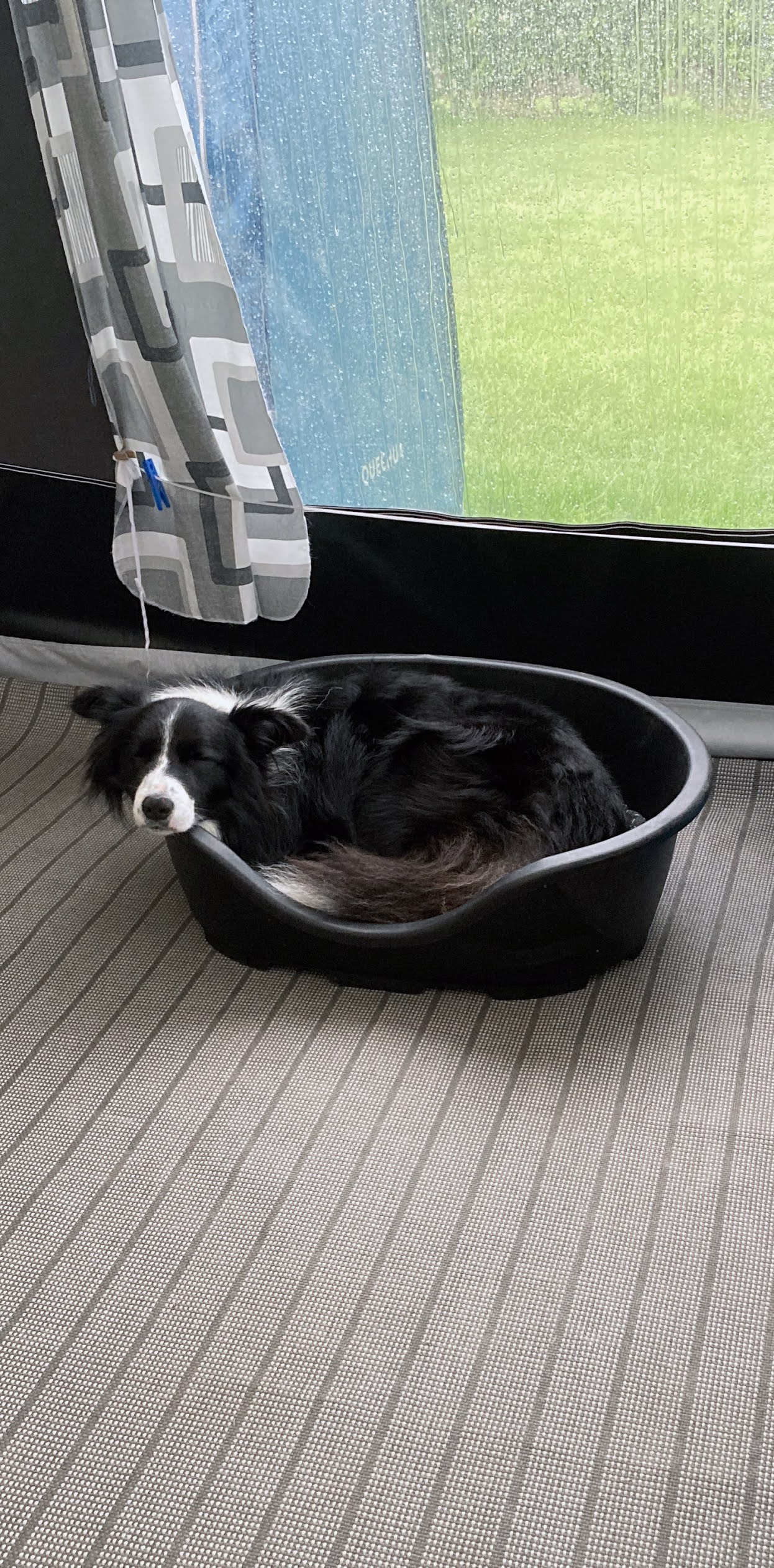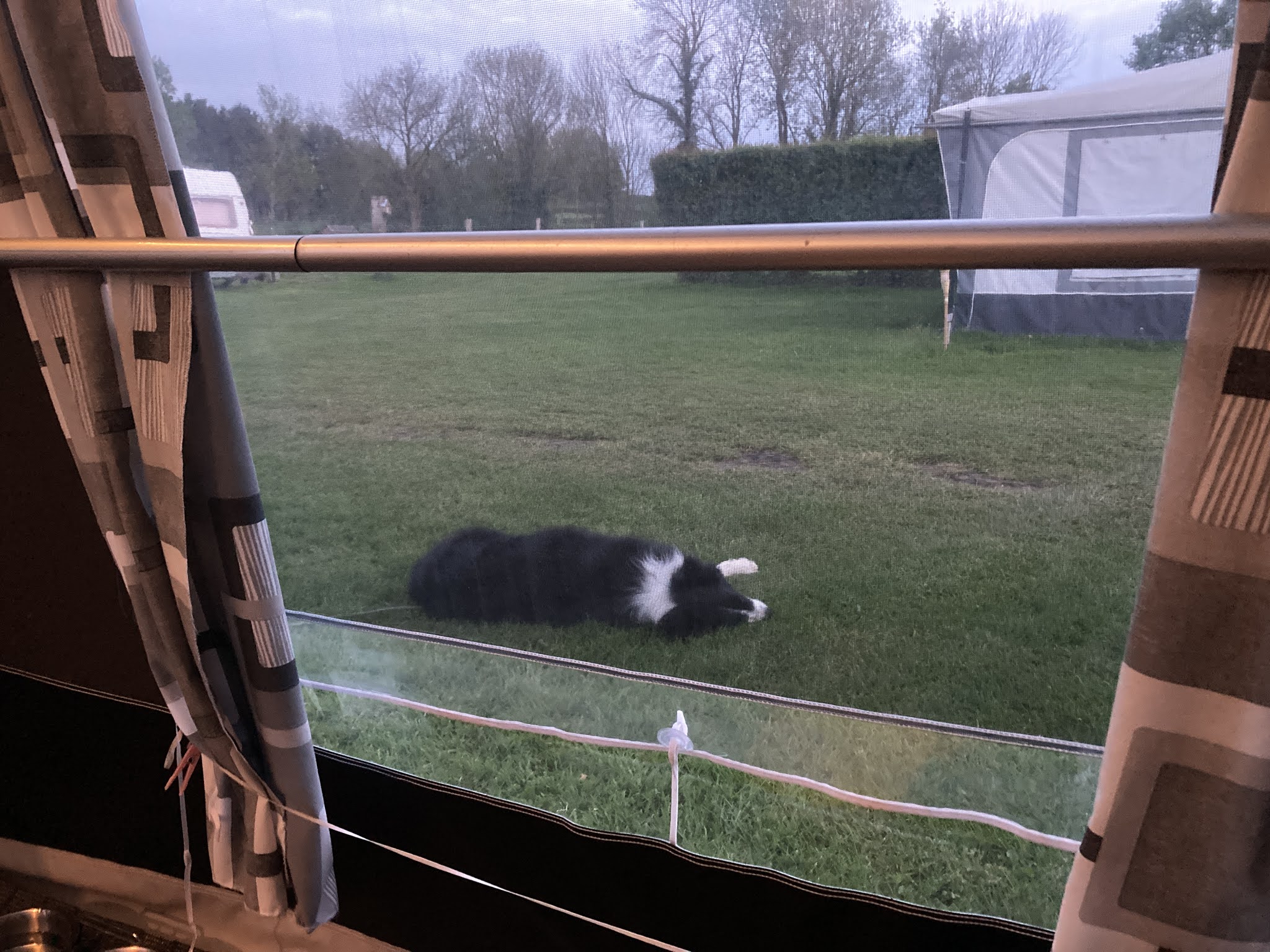 Eigenlijk ben ik altijd het liefste buiten. Ik heb een strategische plek gevonden om ’s avonds te gaan liggen: naast de voortent. Het is namelijk zo dat iedereen die naar het toiletgebouw gaat dan langs mij loopt. Zo ben ik altijd verzekerd van aandacht.